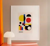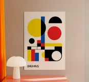 Een krachtige abstracte Bauhaus-compositie gedefinieerd door de dynamische overlapping van geometrische vormen en een gedurfd palet van rood, geel, blauw en zwart. Het ontwerp bestaat uit cirkels van verschillende grootte die elkaar kruisen met verticale en horizontale rechthoeken, waardoor complexe, gelaagde vormen ontstaan. Dit stuk weerspiegelt perfect de constructivistische nadruk op pure geometrie en kleurinteractie. Het is een ideaal statement voor een moderne, minimalistische of Mid-Century inrichting. De digitale poster wordt geleverd met een superieure resolutie van 7000x5000 pixels bij 300 dpi, wat zorgt voor een ongeëvenaarde afdrukkwaliteit en kleurdiepte.