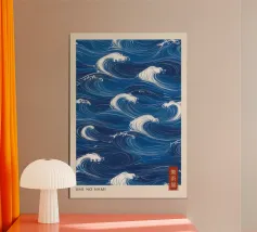 An elegant abstract pattern of blue waves unfolds in this illustration. The flowing curves and subtle gradations of blue create a soothing, rhythmic effect, bringing a touch of harmony and freshness to your space. This timeless design evokes the tranquillity of the sea, ideal for any room where you want to create a calm and serene atmosphere.