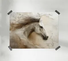 A surreal image depicting a human figure with a horse's head, elegantly wrapped in textured beige fabric. The composition conveys mystery, artistry, and a sense of otherworldly symbolism, blending human and animal elements.
