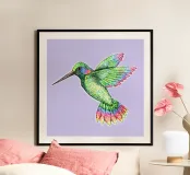 Een tekening met gekleurde fineliners van een vliegende kolibrie.