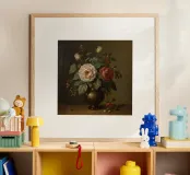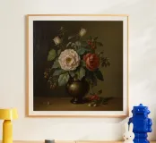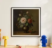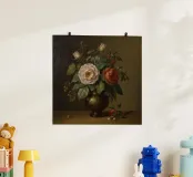 klassiek bloemstuk met rozen in een donkere vaas poster