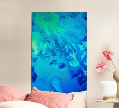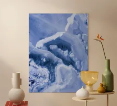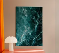 Dit kunstwerk is een meeslepende abstracte compositie geïnspireerd door de beweging en diepte van water. Gelaagde tinten groenblauw, smaragdgroen en diepblauw stromen over het oppervlak en creëren een gevoel van constante beweging en verborgen energie. Penseelstreken met textuur en vloeiende overgangen suggereren erosie, druk en tijd die onder het oppervlak zweeft. Lichtaccenten verschijnen als reflecties of breuken en leiden het oog door de compositie. Het werk roept diepte, transformatie en de stille kracht van ongeziene krachten op.