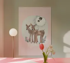 The elegant illustration features three graceful deer amidst a soft background.