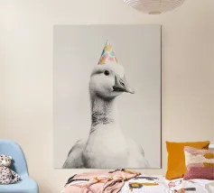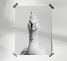 Deze kleurrijke poster van een feestelijke gans met ballonnen brengt vrolijkheid en een glimlach in elke ruimte. Perfect voor een kinderkamer of als origineel cadeau voor een verjaardag.