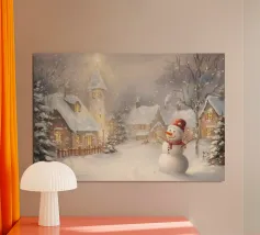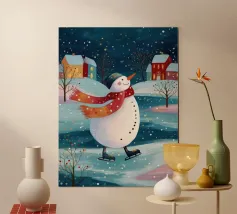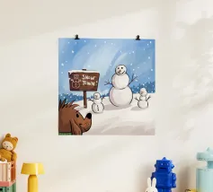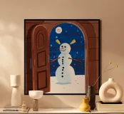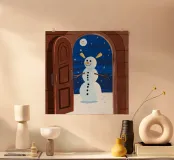 A snowy vista invites a dog and cat to a door where a snowman stands waiting. The frosty ambiance and playful invitation embody the charm of winter magic.