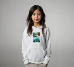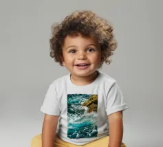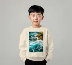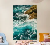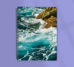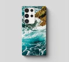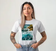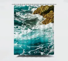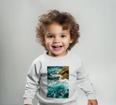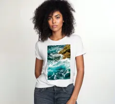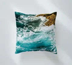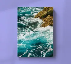 Het zonlicht glinstert op het water en werpt wisselende reflecties van blauw, groen en zilver. Het geluid van de golven is zowel wild als rustgevend en weerspiegelt de uitgestrekte, ongetemde geest van de zee."