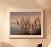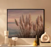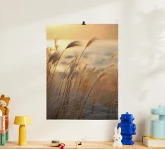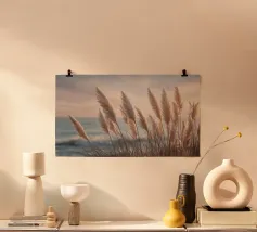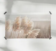 Het pampagras aan de oever rijst op als een delicate droom; filigraan, licht, bijna gewichtloos. De lucht glinstert in zachte tinten roze, abrikoos en lavendel over het stille water. De lucht lijkt vol poëzie, alsof elke stengel een klein verhaal vertelt over de vrede van de avond. Geen enkel geluid verstoort de harmonie. De compositie straalt pure zachtheid uit, een pauze in het moment. Ideaal als meditatieve natuurfoto voor kamers die rust, ruimte en elegantie moeten uitstralen. Deze foto geeft het alledaagse leven een zachte ontsnapping naar het dromerige.