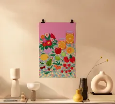 Een moderne en speelse abstracte compositie met een rasterachtige opstelling van kleurrijke, organische vormen. Het kunstwerk voelt aan als een verfijnde en evenwichtige puzzel van vorm en kleur.