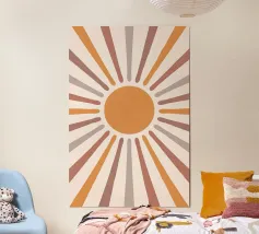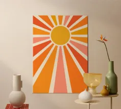 Radiating lines in soft earth tones burst from a semicircle centrally positioned at the bottom, creating a sunburst effect. The design uses warm hues of peach, cream, and brown, adding a retro aesthetic.