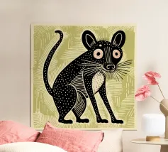 Een vlekkerige aquareltekening van een zwarte rat. Grunge druipende stijl. Hij heeft grote paarse ogen. Hij kijkt je verbijsterd aan.