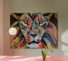 Breng kleur en stijl in je ruimte met deze prachtige houten ingelijste kunstafdruk van een majestueuze leeuw. De mix van zwart, wit en spetterende kleuren geeft deze afdruk een dynamisch en modern gevoel, perfect voor elke woonkamer, slaapkamer of studeerkamer. Ideaal voor liefhebbers van dieren, kunst of unieke decoratie. Deze afdruk is niet alleen mooi, maar ook een echte conversatiestarter, perfect als cadeau voor special occasions of om jezelf te verwennen. Hang hem op of zet hem op een boekenplank, het zal scherp opvallen!