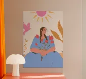 Een persoon in een blauwe jurk houdt een boeket bloemen vast. Op de achtergrond een zon en abstracte bloempatronen.