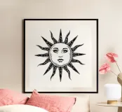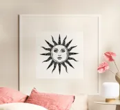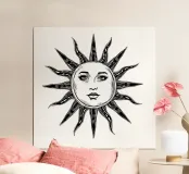 Een betoverende zwart-wit illustratie van een stralende zon met een menselijk gezicht. De expressieve ogen en tere lippen van de zon geven hem een mystieke en hemelse aanwezigheid, terwijl de getextureerde stralen zich naar buiten uitstrekken in een organisch, vloeiend patroon. Het kunstwerk mengt symboliek en natuur en roept thema's op als warmte, energie en kosmische harmonie.