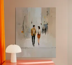 Dive into the vibrant chaos of urban life with this abstract masterpiece. Bold splashes of orange and muted tones create a dynamic backdrop, capturing the essence of a bustling metropolis. Figures move through the haze, embodying the rhythm of city dwellers navigating their daily grind. It’s a snapshot of modern existence—where anonymity meets connection. Perfect for those who appreciate the pulse of city life and the stories hidden in every corner.