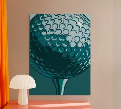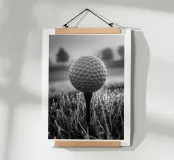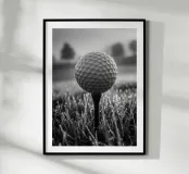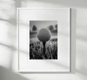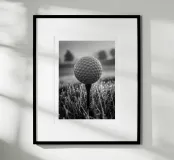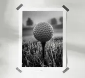 Zwart-witfoto van een golfbal op een tee, bedekt met dauw. De heldere cellen steken af tegen een bokeh van glinsterend gras en silhouetten van bomen op de achtergrond. Zacht ochtendlicht, een kalme sfeer voor de drive, een minimalistische, sportieve compositie. Een elegante, grafische poster voor kantoor, woonkamer, clubhuis of sporthoek. Perfect als muurkunst voor golfliefhebbers, modern en contemplatief.
