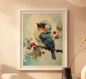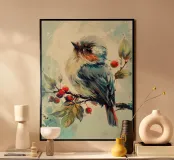Kleurrijke vogel neergestreken op een tak tussen bladeren en bessen poster