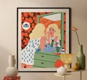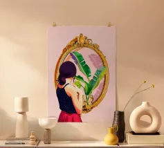 This artwork shows a person with blonde hair looking into a vanity mirror. The background is filled with floral wallpaper, and the vanity table is adorned with various items, creating a nostalgic and intimate scene.