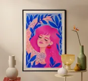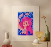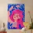 This artwork features a figure with pink hair, set against a background filled with blue and pink floral elements. The scene is vibrant and whimsical, full of playful energy.