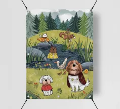 Dit kunstwerk toont een chagrijnige wolk met een gedachtewolkje met daarin een vogel en een beer. Het humoristische en fantasierijke tafereel speelt zich af tegen een zachtblauwe achtergrond.