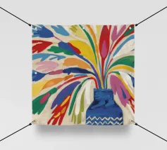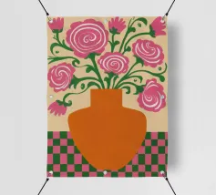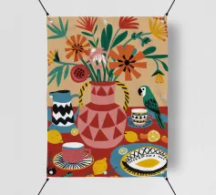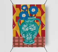 Een vrolijk stilleven van een boeket rode klaprozen in een terracotta vaas, tegen een vrolijke, patchworkachtige achtergrond van gele en blauwe tegels.