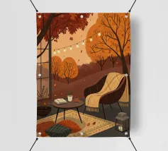 Zachte, minimale verlichting van een gestreepte lamp werpt gedessineerde schaduwen over een donker terras. Twee stoelen doemen rustig op in de achtergrond en creëren een mysterieuze, intieme sfeer 's nachts. Dit kunstwerk is geschikt voor ruimtes als slaapkamers, leeshoekjes, gezellige lounges, moderne woonkamers of elke andere plek waar subtiel licht en een contemplatieve sfeer op prijs worden gesteld.