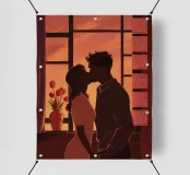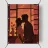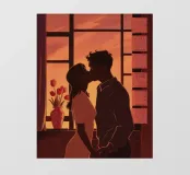 Een romantisch silhouet van een stel dat hartstochtelijk kust bij een groot raam, badend in de warme, oranje gloed van een ondergaande zon.