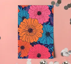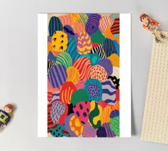 Een levendige lappendeken van verschillende patronen en motieven, een combinatie van bloemenelementen, abstracte vormen en tegelmotieven. De eclectische mix van kleuren en stijlen creëert een visueel rijke en vrolijke compositie die doet denken aan een mediterrane tegelwand.