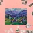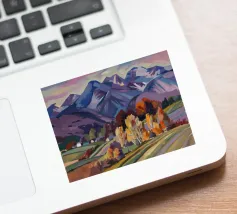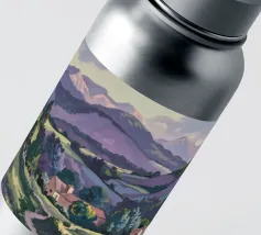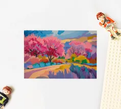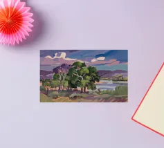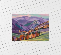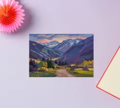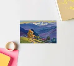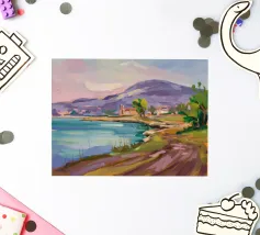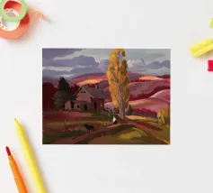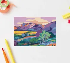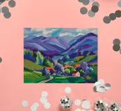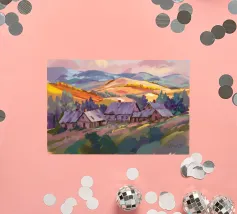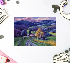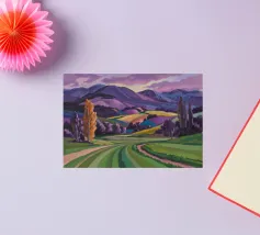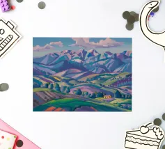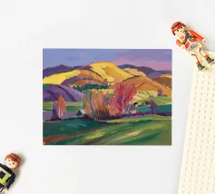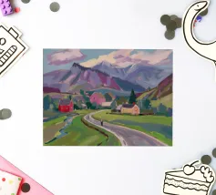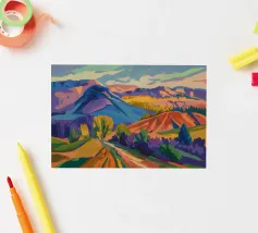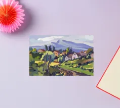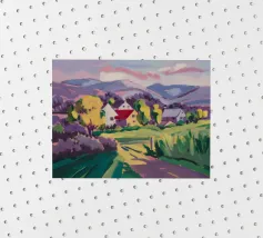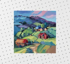 Een kleurrijk landschapsschilderij toont een dorp genesteld op een heuvel met levendige, patchwork-achtige velden in groene, blauwe en paarse tinten, met roodgedekte huizen onder een heldere hemel.