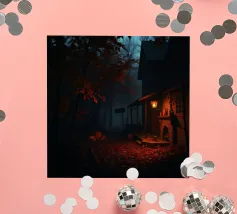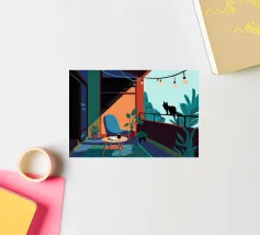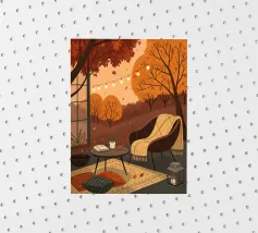 Zachte, minimale verlichting van een gestreepte lamp werpt gedessineerde schaduwen over een donker terras. Twee stoelen doemen rustig op in de achtergrond en creëren een mysterieuze, intieme sfeer 's nachts. Dit kunstwerk is geschikt voor ruimtes als slaapkamers, leeshoekjes, gezellige lounges, moderne woonkamers of elke andere plek waar subtiel licht en een contemplatieve sfeer op prijs worden gesteld.