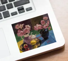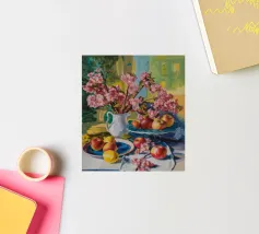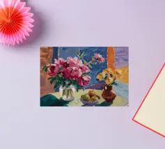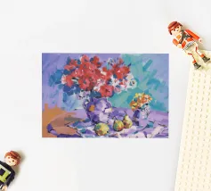 Een gedurfd stilleven met levendige roodroze bloemen, mogelijk klaprozen of geraniums, in een eenvoudige vaas, naast frisgroene peren, alles op een rijk rood tafelkleed dat scherp contrasteert met een diepblauwe achtergrond.