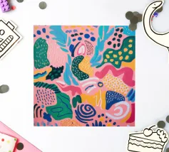 An abstract composition of flowing, wavy lines and organic shapes in a vibrant palette of green, pink, blue, and orange, creating a sense of joyful movement and rhythm.