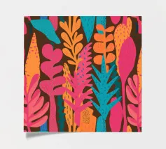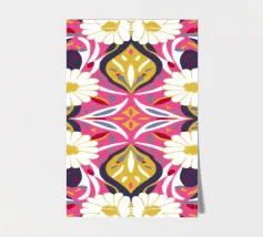 Een levendige lappendeken van verschillende patronen en motieven, een combinatie van bloemenelementen, abstracte vormen en tegelmotieven. De eclectische mix van kleuren en stijlen creëert een visueel rijke en vrolijke compositie die doet denken aan een mediterrane tegelwand.