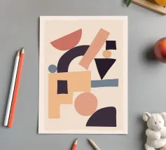An abstract artwork of geometric shapes in earthy green, orange, and beige tones, arranged with balance on a textured light background.
