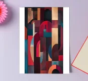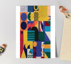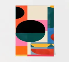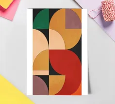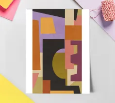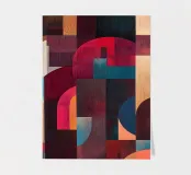 A rich, contemporary abstract composition built from layered geometric forms and deep, atmospheric colour. Curves and blocks intersect in a carefully balanced arrangement, creating a sense of architectural rhythm and visual depth. The surface texture adds a subtle, painterly warmth, softening the geometry and giving the work a tactile, crafted presence.