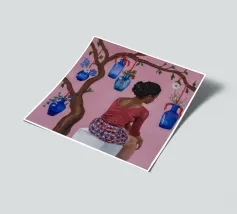Dit kunstwerk toont een persoon die op een gestreepte stoel zit, omringd door zonnebloemen en een groene tas. De achtergrond is gedempt bruin en creëert een rustieke en reflecterende sfeer.
