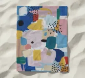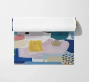 Een abstract patchwork van geschilderde, gestructureerde vormen in een gedempt palet van blauw, oker en beige creëert een verfijnde en prachtig uitgebalanceerde compositie met een artistieke, handgemaakte uitstraling.