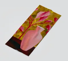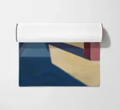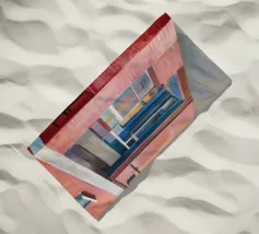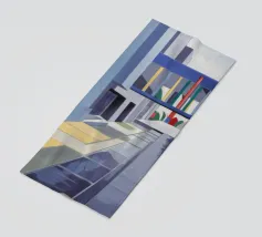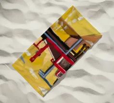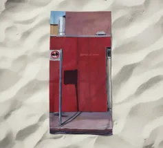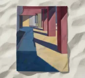 De grimmige geometrie van een overdekte wandelgang wordt gedefinieerd door krachtige karmozijnrode pilaren en de lange, scherpe schaduwen die ze werpen in het felle zonlicht. Dit schilderij is een krachtige studie van licht, schaduw, kleur en architectonische vorm.