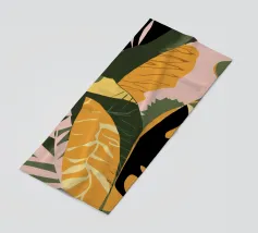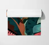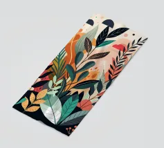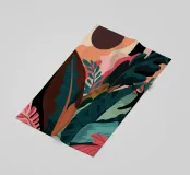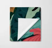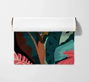 Een elegante en stemmige compositie van donkere, overlappende tropische bladeren met vleugjes oranje en wit, waardoor een geraffineerd en dramatisch spel van schaduw en licht ontstaat.