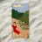 Een illustratie van een vrouw in een rode jurk, zittend in een veld met een olijfboom en een windmolen op de achtergrond. De scène is een serene, schilderachtige en tijdloze voorstelling van een vredige dag op het platteland.