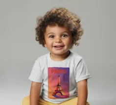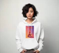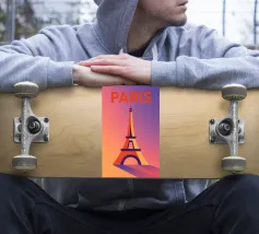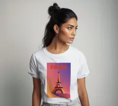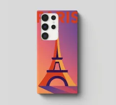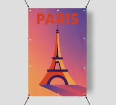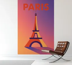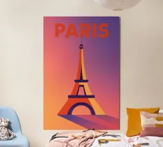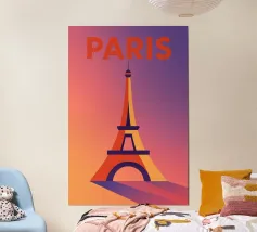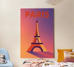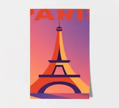 Een minimalistische, levendige poster die alle magie van Parijs in haar gouden uur vastlegt. De Eiffeltoren rijst elegant op tegen een gradatie van paars, roze en oranje, en roept de poëzie van een Parijse schemering op. Deze illustratie is perfect voor een chique, stedelijke inrichting en moderniseert het Franse icoon met stijl en zachtheid.