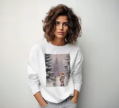 Vredige winterse scène met een kind in een witte jas en roze sjaal dat naar een kleine, verlichte besneeuwde boom reikt, omringd door hoge, besneeuwde bomen.