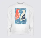 Stijlvolle illustratie van twee meeuwen in een modern volkskunstontwerp tegen een blauwe achtergrond. De elegante kleurencombinatie van koraal, roomwit en marineblauw creëert een harmonieus, maritiem contrast. De vereenvoudigde vormen en decoratieve vleugelpatronen tonen invloeden van Scandinavische en Japanse grafische tradities. De heldere lijnen geven het motief een tijdloze, vriendelijke en optimistische uitstraling. Perfect voor iedereen die partnerschap, evenwicht en natuurlijke eenvoud wil uitstralen.