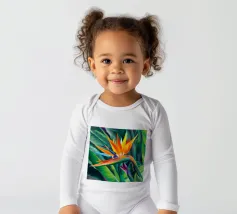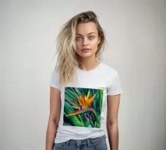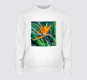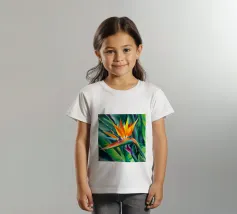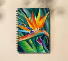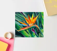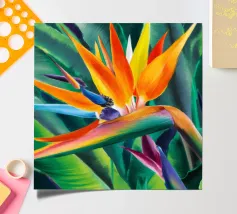 Dit schilderij toont een paradijsvogelbloem in volle bloei, waarbij de fel oranje en blauwe bloemblaadjes afsteken tegen de groene bladeren. De levendige kleuren en ingewikkelde details benadrukken de exotische schoonheid van de bloem.