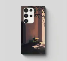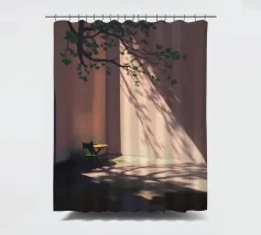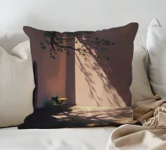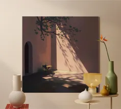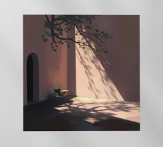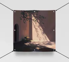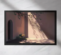 Zonlicht valt door bladeren en werpt zachte schaduwen op een rustieke tafel en stoel in een vredige binnenplaats. Deze serene omgeving nodigt uit tot ontspanning en contemplatie.