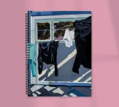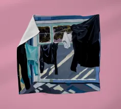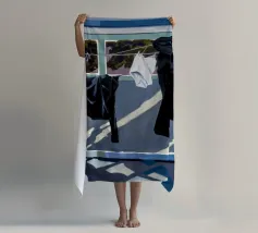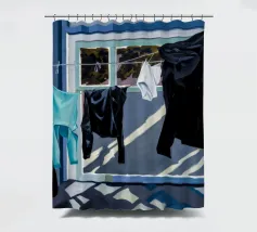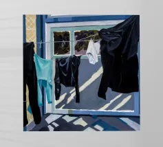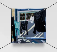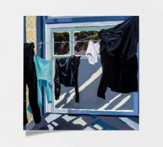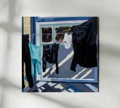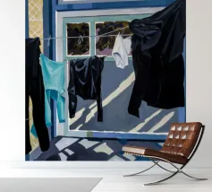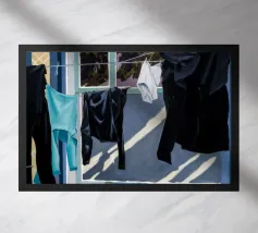 Zwart-wit wasgoed hangt aan een waslijn en werpt sterke, dramatische schaduwen op een zonovergoten muur in een krachtige weergave van licht en vorm.