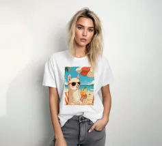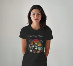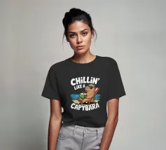 Een ontspannen capibara met zonnebril ligt op een strand met een tropisch drankje en een levendige zonsondergang op de achtergrond. De zin "Chill Vibes Only" staat prominent naast de capibara.