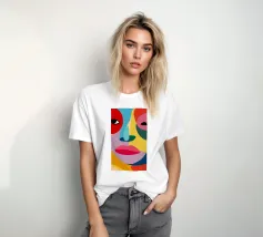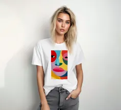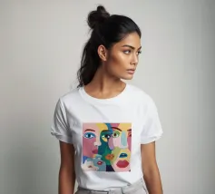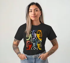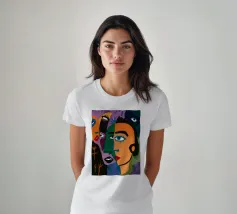 Een op kubisme geïnspireerd kunstwerk met meerdere overlappende en gefragmenteerde gezichten. De gedurfde lijnen en het levendige kleurenpalet creëren een dynamische en expressieve compositie die verschillende facetten van identiteit verkent.