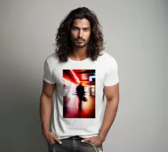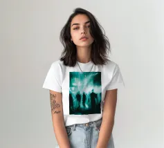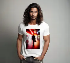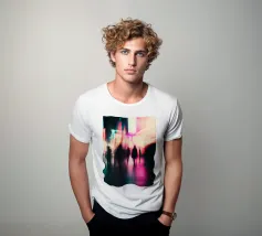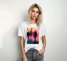 In een explosie van groen en geel gaan twee silhouetten op in het lichtgevende stadslandschap. Een abstracte, elektrische visie die de intensiteit van nachtelijke beweging, tussen werkelijkheid en illusie, vastlegt. Ideaal voor wie op zoek is naar een levendig, meeslepend werk.
