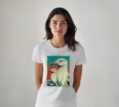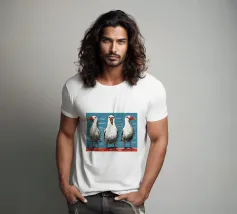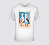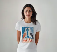 Heerlijk charmant! Deze prachtige illustratie toont twee gestileerde zeevogels in een delicate dialoog. Het gereduceerde kleurenpalet van blauw, oranje en grijs en de naïeve, moderne lijnen doen denken aan Scandinavische boekkunst en volkskunst. De karakteristieke oranje sterpootjes en vereenvoudigde verendetails geven het motief een speels karakter. De losse penseelstreken en golvende achtergrondlijnen creëren een maritieme lichtheid. Perfect voor kustliefhebbers en iedereen die vrolijke, ongecompliceerde muurkunst waardeert! Deze poster brengt een vakantiegevoel in het dagelijks leven.