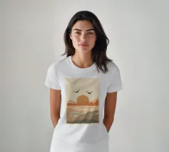 Een serene landschapsillustratie van meeuwen die over een kalme zee vliegen naar een ondergaande zon, met bergen op de achtergrond, alles in een zacht, warm kleurenpalet.